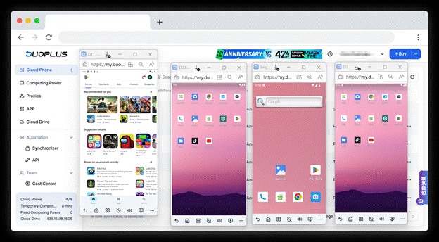 DuoPlus is a cloud-based antidetect solution that allows users to run multiple real Android devices in the cloud, each with its own unique device environment and fingerprint. Unlike traditional emulators or virtual machines, DuoPlus provides real device instances, which makes the online behavior appear completely natural to platforms and anti-fraud systems.